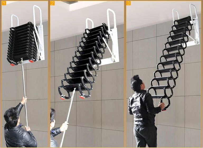 Cầu thang gác xếp gọn thông minh có 3 loại: Cầu thang ốp trần, thang ốp tường và thang cửa đứng.