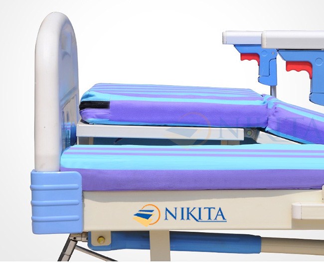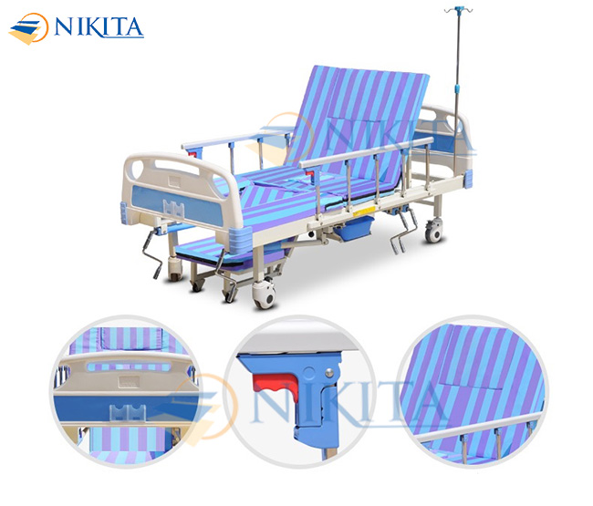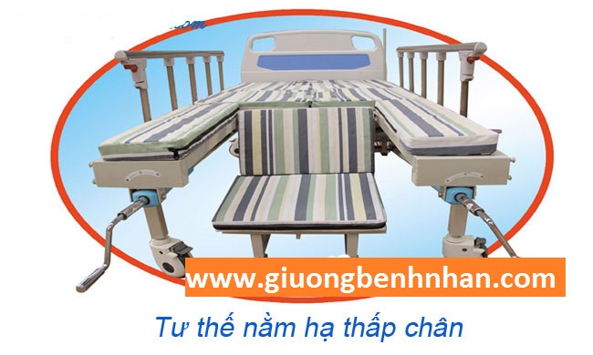 Giường được trang bị hệ thống 5 tay quay đồng trục làm bằng inox, thiết kế đơn giản nhưng thông minh cho phép điều khiển hết các chức năng của giường. Một tay quay điều khiển nâng đầu, 1 tay quay điều khiển nâng hạ chân, một tay quay điều khiển bô vệ sinh, đặc biệt một tay quay giúp nghiêng trái, và 1 tay quay điều chỉnh nghiêng phải. Giường có thể nâng đầu đến 85 độ, nâng và hạ chân linh hoạt tạo thành một ghế tượng đa năng giúp người bệnh ngồi dậy.