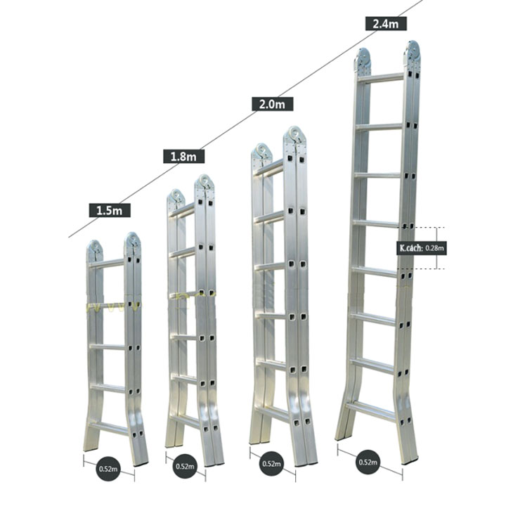 - Ưu điểm lớn nhất là chiếc thang được thiết kế theo hình chữ A và I sẽ tăng độ chắc chắn cho khớp nối. Thang có thể gấp gọn sau khi sử dụng hoặc duỗi thẳng chữ A từ 2m5 và 5m. Do vậy, bạn sẽ không gặp khó khăn trong quá trình sử dụng, di chuyển và cất gọn ngay sau khi dùng rất dễ dàng nữa nhé.