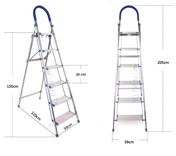 - 6 bậc thang làm bằng nhôm bản ghế rộng cùng những đường chỉ giúp tăng khả năng bám dính và độ ma sát của chân khi bước lên thang.
