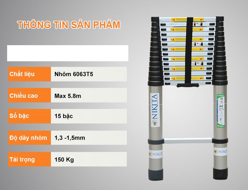 - Thang nhôm rút Nikita R58 có trọng lượng nhẹ, nhỏ gọn khi thu lại, tính cơ động cao dễ dàng mang vác đi lại. Bạn có thể dùng chiếc thang này lắp bóng đèm, móc dây quần áo, treo tranh ảnh hay tậm chí là vận chuyển, mang vác thiết bị, sản phẩm rất tiện lợi.