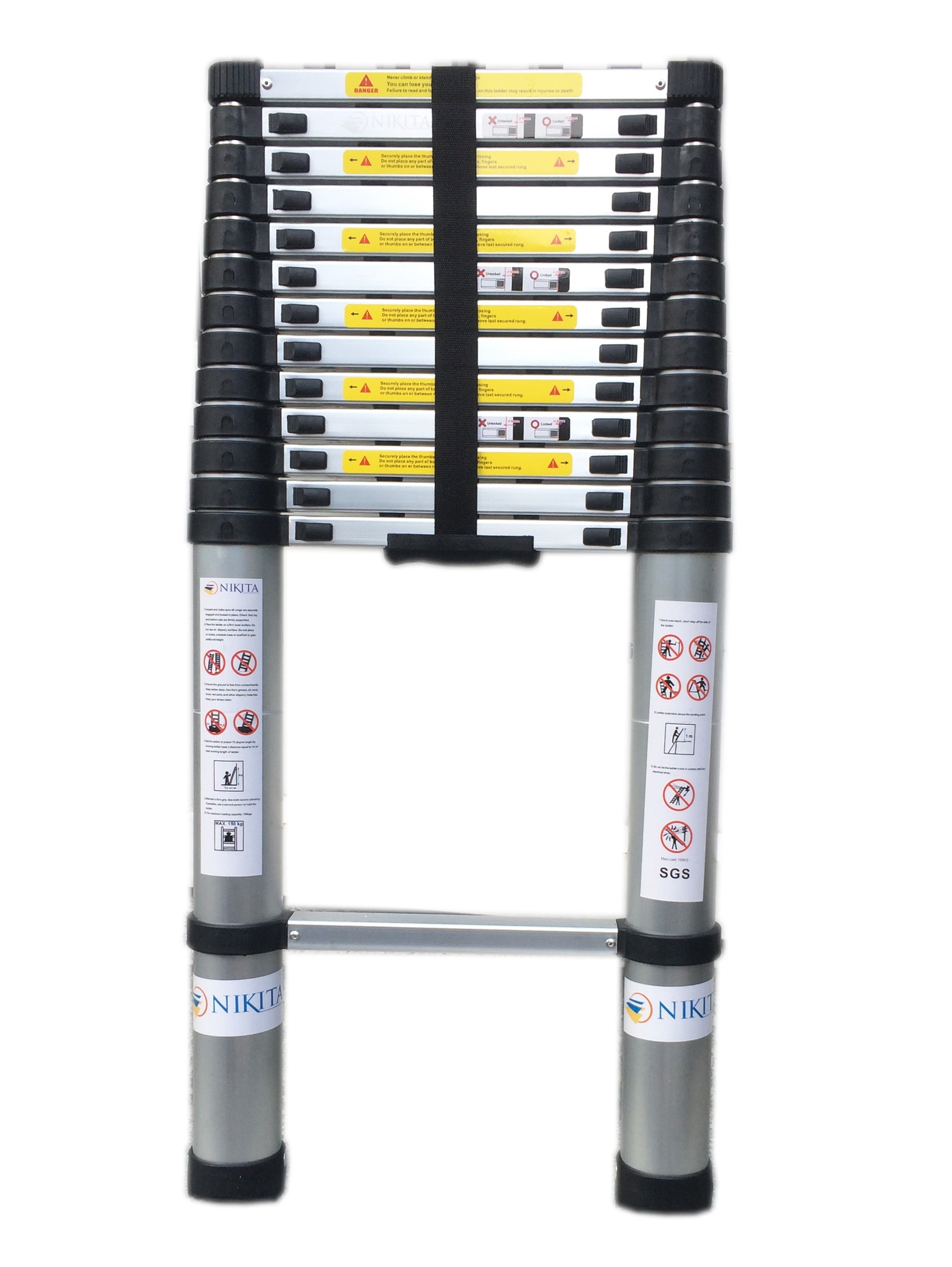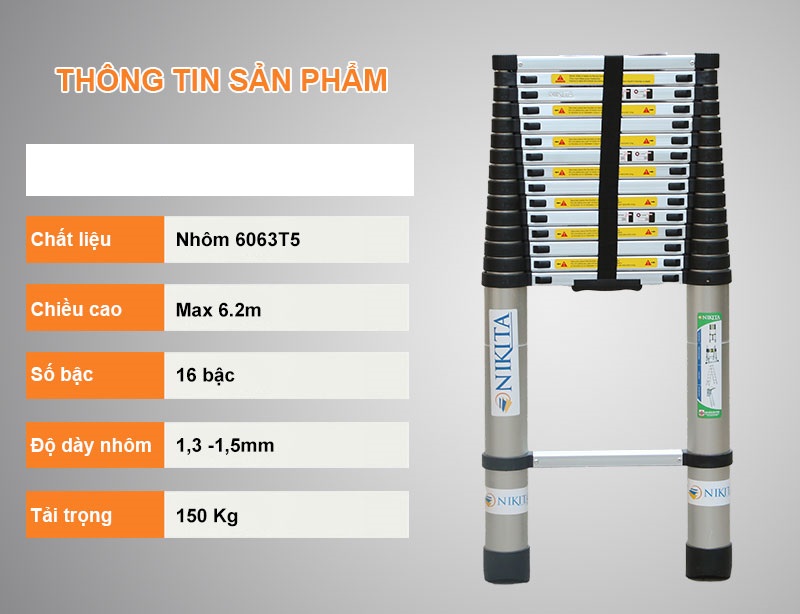 - Thang nhôm rút Nikita R62 có trọng lượng nhẹ, nhỏ gọn khi thu lại, tính cơ động cao dễ dàng mang vác đi lại. Bạn có thể dùng chiếc thang này lắp bóng đèm, móc dây quần áo, treo tranh ảnh hay tậm chí là vận chuyển, mang vác thiết bị, sản phẩm rất tiện lợi.
